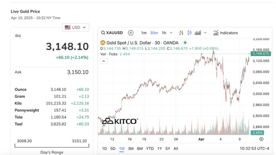 Tối 10/4, giá vàng thế giới ghi nhận đà tăng đột biến khi nhà đầu tư toàn cầu gia tăng nhu cầu trú ẩn an toàn giữa bối cảnh thị trường tài chính tiềm ẩn nhiều rủi ro.